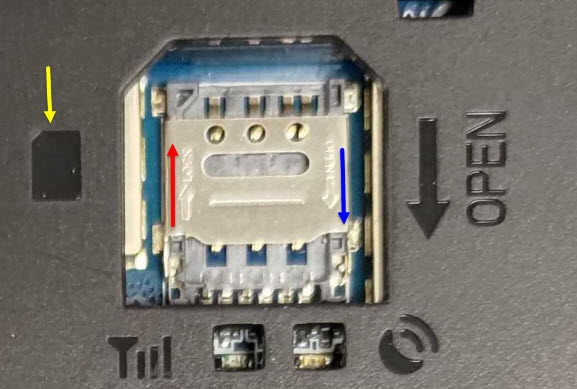 - Coloque la sim card (asegúrese de colocarla en la posición apropiada, usando la esquina cortada como guía, Flecha amarilla en la foto más abajo) con la parte de metal de la simcard en dirección del dispositivo, haciendo contacto con los pines de metal del compartimiento de la sim card en el equipo.