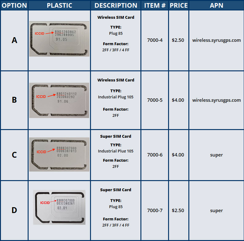 In the picture below we can identify the different Sim sizes used in each of our Syrus family of devices